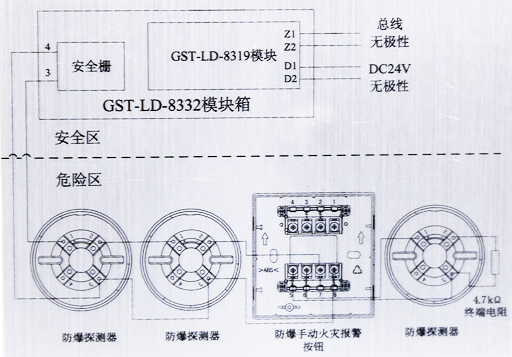 5.線制:與控制器采用無極性兩總線連接;與DC24V電源線采用無極性兩線制連接;與防爆設(shè)備采用有極性兩線制連接