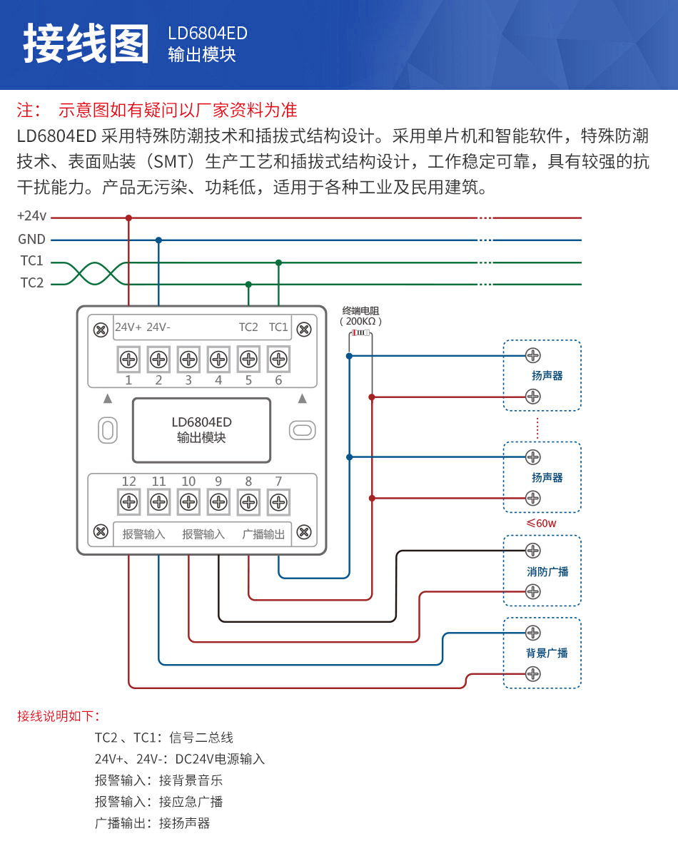 1、LD6804ED輸出模塊為二總線,無極性。