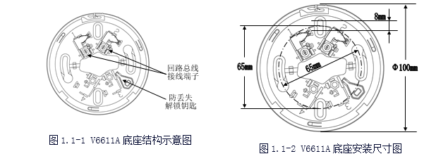 V6611A探測器底座結構簡單、安裝方便、結構件配合牢固;具有探測器防丟失結構設計,每只底座均備有專用的解鎖鑰匙。底座備有長圓形安裝定位孔,可適應于86H50型標準預埋盒及其它型號的預埋盒。