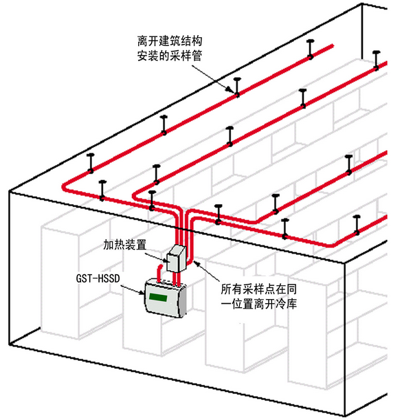 冷庫中采樣管,加熱箱和吸氣式感煙火災探測器的相對位置