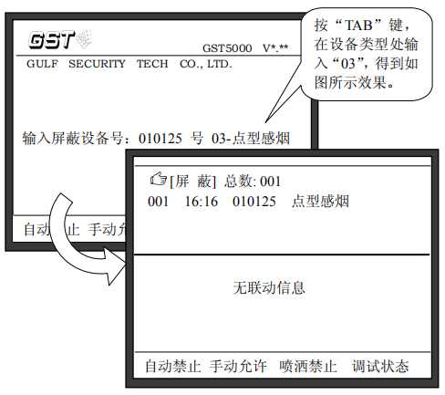 注意:在進行消防主機“屏蔽”操作中輸入設備的編碼時,可以使用通配符“*”,“*”代表這一位可以是0~9中的任意一個數字,這個功能可以方便的將一類設備取消屏蔽。例如:如果要屏蔽掉系統(tǒng)中所有的點型感煙火災探測器,我們可以在屏蔽操作時輸入:“******”,“TAB”,“03”,這樣所有點型感煙火災探測器將被屏蔽。其中“03”為點型感煙火災探測器設備類型代碼。