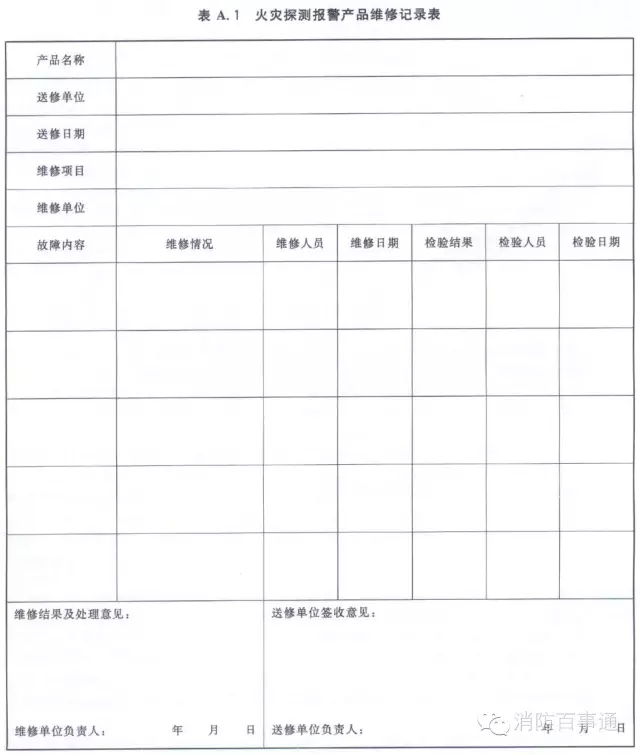 3.1.6承擔維修的企業應做好維修記錄,與產品使用或管理單位各執一份,并保存至該產品報廢。火災探測報警產品維修記錄表的格式參見附錄A。