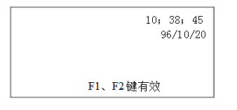 密碼正確后顯示如上面菜單,密碼錯誤則返回封面菜單。  其中小時處(即數(shù)字“10”反顯,用“F1”鍵進行切換,依次反顯時、分、秒、年、月、日,用“F2”鍵進行反顯處時間修改,每按一次“F2”鍵,反顯處數(shù)字增一。