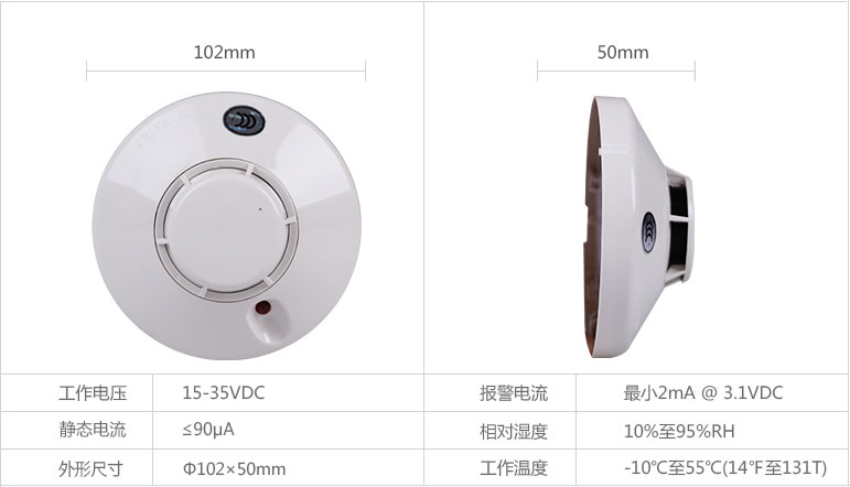 這款JTY-GD-882光電感煙火災探測器是一種傳統型光電感煙探測器,擁有美觀的光電室。整體外形就比較普通,大小還是算中等的,造型中規中矩。煙感大直徑為102mm,不帶底座高為50mm,重量約為75g。設計這類探測器是為了對開放式區域提供保護,且需與兼容的控制器配套使用。當JTY-GD-882探測器處于報警狀態時,發光二極管(LED)鎖定恒亮。