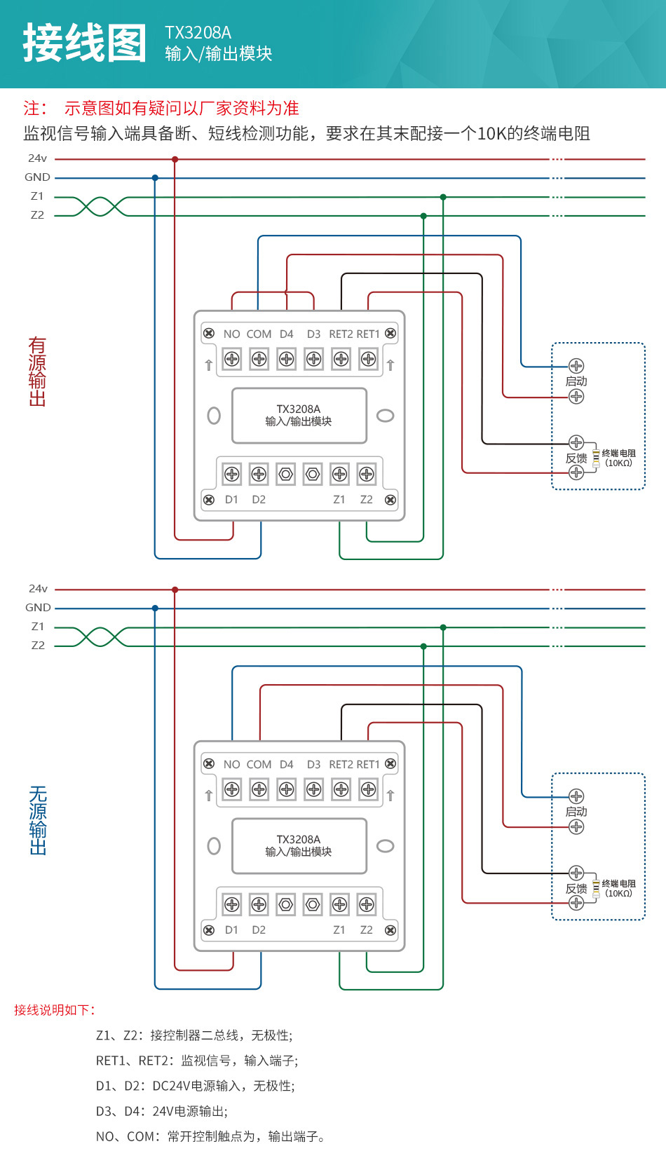 注意:模塊的反饋輸入端具備斷、短線檢測功能,要求在其末端配接一個10K的終端電阻,否則控制器將報出該產品反饋端故障;對于控制線也具備斷、短線檢測功能,當模塊不動作時,要求常開輸出端的電壓在DC12-48V之間,否則控制器將報出該模塊輸出線故障。